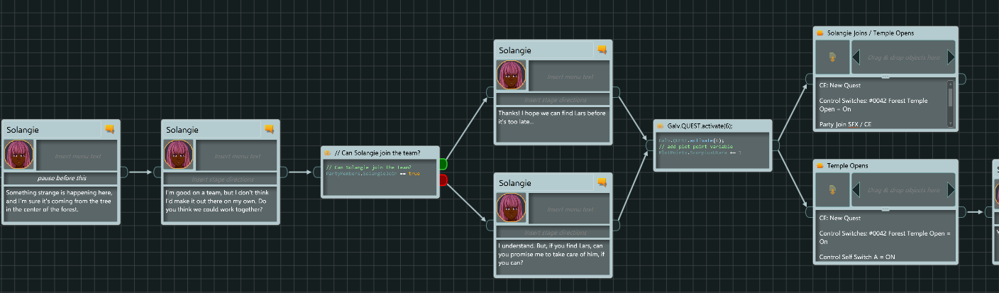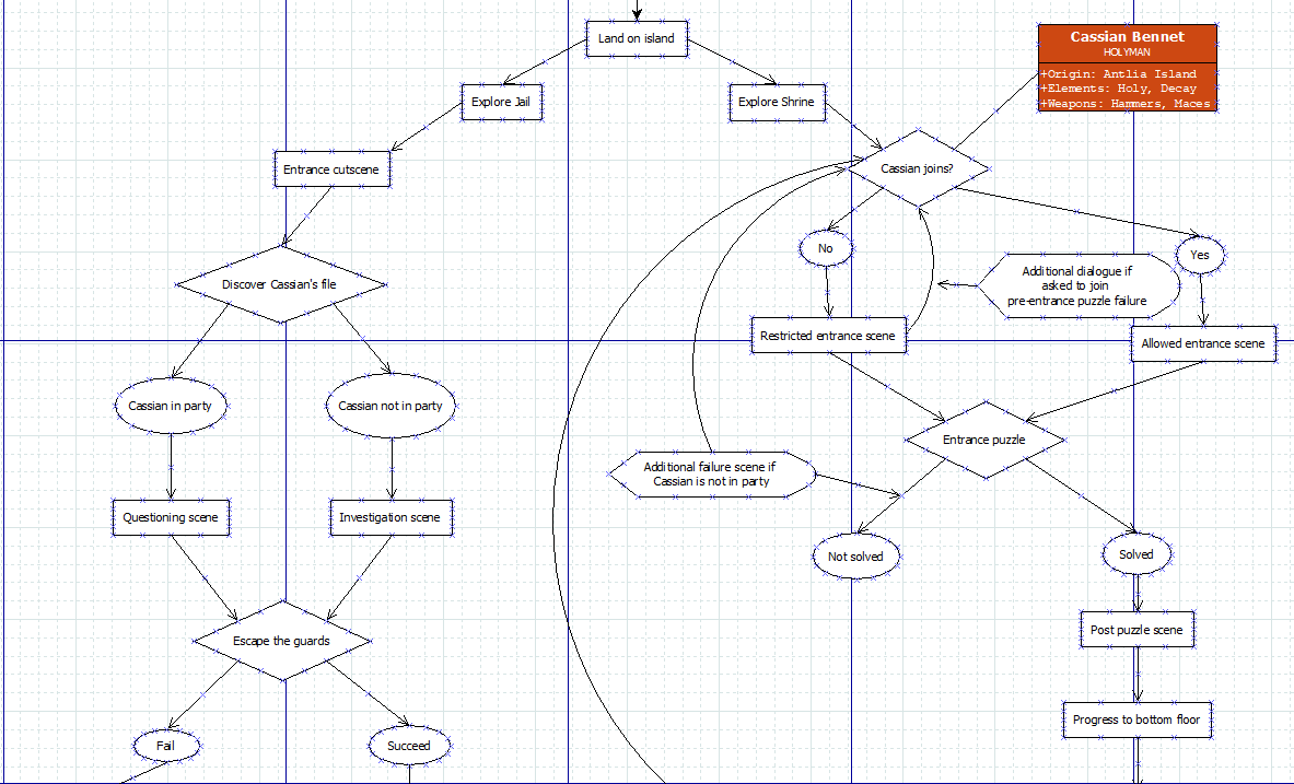 It’s also given me the opportunity to make sure each character joins the party for a purpose. Because if they don’t have a distinct purpose and reason to join the party, they need to be reconsidered as a party member and made into an NPC instead. Some of the areas in that flowchart are barely more than “intro scene,” but it tells me that something has to happen there.